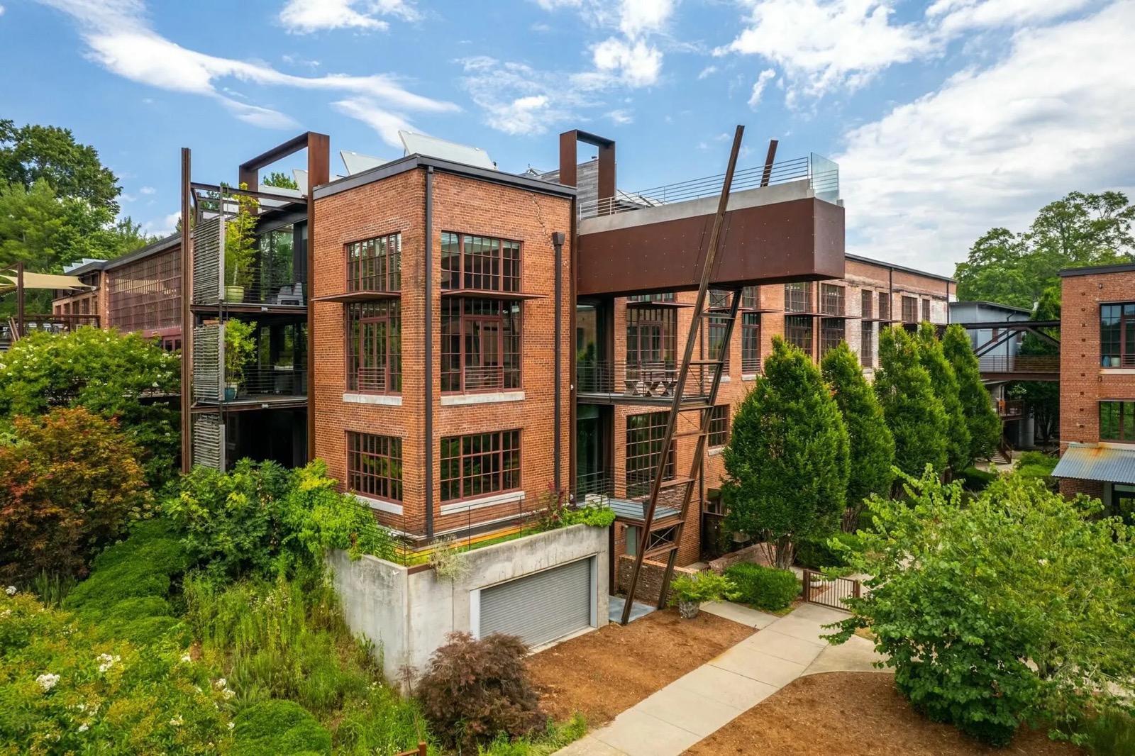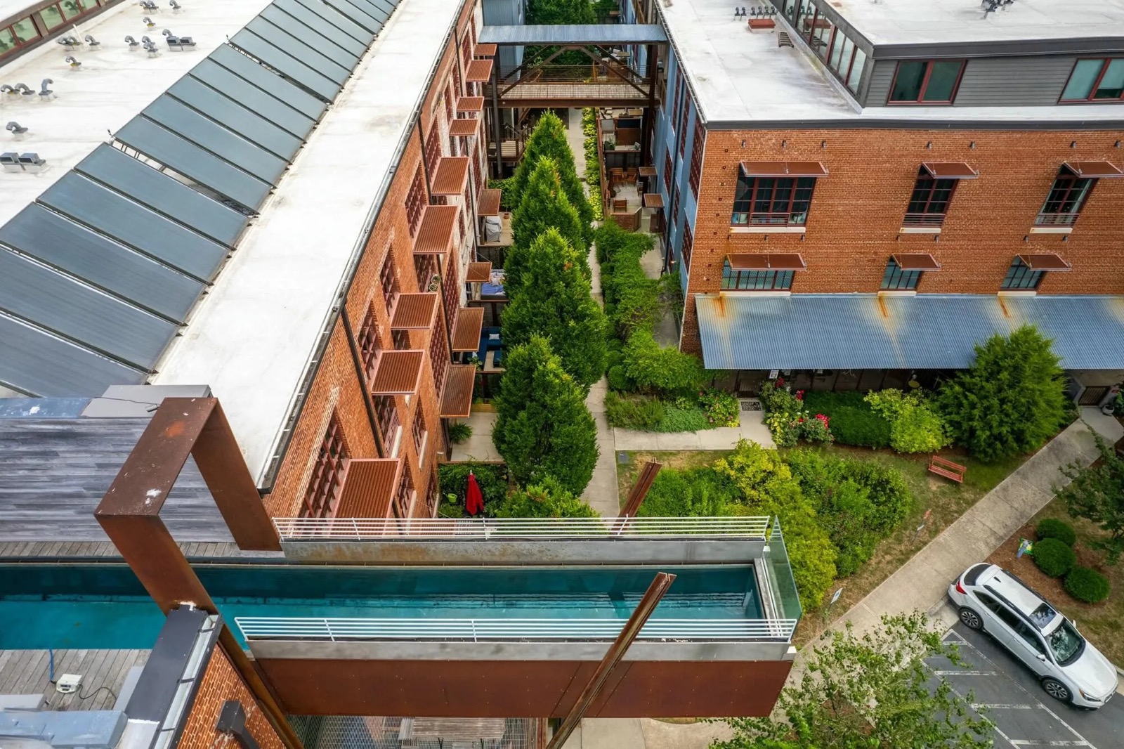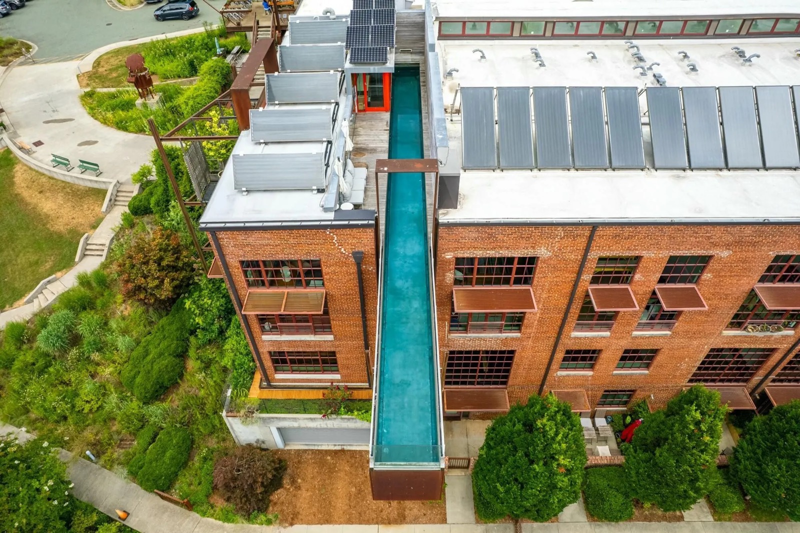 Adaptive reuse renovation project adding a private residence and swimming pool to the historic textile mill building in Saxapahaw